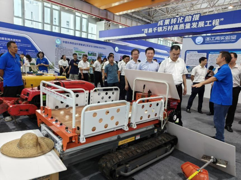 活动参观环节,邓远宝所长向市委市政府主要领导一行介绍了农业机械研究所的重要科研成果,包括菠萝叶纤维新材料与功能性产品开发、丘陵果园轻简化遥控作业机城装备、菠萝移栽和收获关键技术与装备、甘蔗预切种式种植和蔗苗移栽装备等。