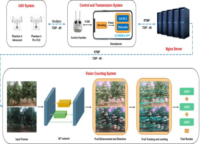 研究首先搭建一套果园场景下的无人机直播平台,同时相应开发了一个名为FlyCounter的飞行控制APP,实现无人机自主飞行和高质量视频流的在线获取; 其次,提出了一种基于Fruit-YOLO的果实识别模型,结合IAT网络有效解决了果园复杂光线场景下重叠遮挡和小目标果实的漏检难题;最后,采用DeepSORT算法为画面中的每个柑橘分配一个特定ID并跨帧跟踪目标,最终实现果园全局计数。本研究提出了一种强鲁棒性、端到端的无人机水果计数系统,并探索分析实际场景下多无人机并行作业的可行性。系统首次实现多无人机在果园低照度场景下的在线估计作业。研究结果可拓展至果园多种类水果的智能化估产,以尽早为种植户在当年制定决策提供有效的信息。