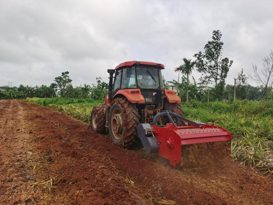 在示范基地现场,团队重点演示了 1HJ-150 型双辊菠萝叶粉碎还田机。该机采用双辊式结构设计,作业幅宽达 1.5 米,作业效率为 5 亩/小时,菠萝叶粉碎率≥90%。相较于传统单辊粉碎设备需分两次完成粉碎作业,该机型借助双辊的协同粉碎和抛送作用,仅需一次作业即可达到高质量粉碎效果,效率较传统设备提升近一倍,真正实现了菠萝叶粉碎还田 “一步到位”。