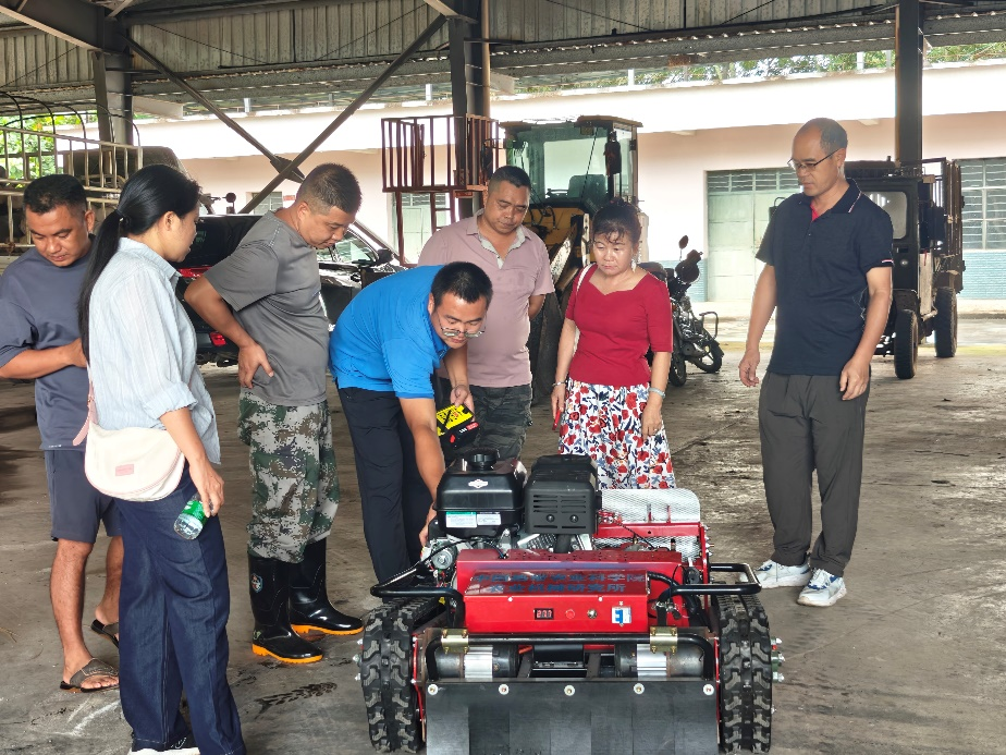 作为专委会带头人,邓怡国研究员长期致力于破解丘陵山地胶园生产管理机械化难题。此次活动,专委会不仅带来了前沿的科研理念,更带来了团队最新的研发成果——专为复杂地形设计的小型遥控式除草机与手扶式螺旋施肥机。在基地现场,助理研究员燕波面向临沧试验站的技术骨干和生产一线人员开展了设备交付与详细的操作应用培训。培训内容紧密结合丘陵胶园实际,重点讲解了设备性能优势、安全操作规范及胶园内高效使用技巧,为提升基地的技术示范能力注入了实实在在的“机械化新动能”。